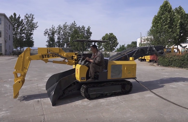 履带刮板扒渣机为全液压履带结构,选用反铲系统来扒取岩石、矿石,将岩石、矿石扒入刮板运送槽,并依托刮板运送系统将岩石、矿石从前部输送至后部的接续设备中,比如各类矿车、皮带机、汽车等,同时,履带扒渣机的铲斗也可以用来整理工作面,该设备的底盘规划参考小松挖掘机结构形式,选用液压马达驱动履带行走系统,性能强劲、爬坡力强、机动灵活,可在潮湿有积水的巷道里工作。